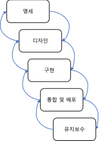 1. 요구분석 ⇒ 2. 설계 ⇒ 3. 구현(코딩) ⇒ 4. 시험(검사) ⇒ 5. 유지보수