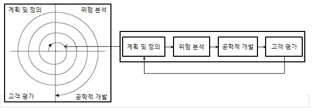 1. 계획 수립 ⇒ 2. 위험 분석 ⇒ 3. 개발 및 검증 ⇒ 4. 고객평가 ⇒ 1. 계획 수립(다시)